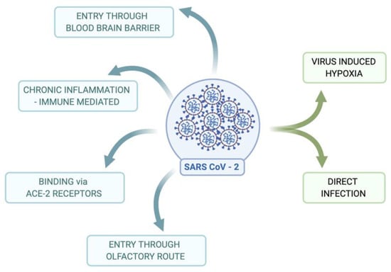 Neuro-invasive and neurotropic SARS-CoV-2 exerts different infection stages, starting with a marked loss of smell and or taste during the early stages of infection to immunomodulatory effects affiliated with seizures at later stages [25]. Even though the brain is highly guarded and protected by the blood–brain barrier (BBB), and blood–CSF barriers protect the brain from the entry of external molecules, pathogens, and cells, the permeability of the BBB is strictly controlled by tight junctions (TJ) by continuous capillaries with no fenestrations [32,33,34]. As neurotropic viruses such as SARS-CoV-2 enter the CNS from the primary infection site, they invade the nervous tissues and disrupt its homeostasis, causing infections [24]. Inflammation of the CNS, known as neuroinflammation, includes both immunological and neuronal cells and results in a modulation of the immune response of the nervous system and synaptic plasticity [35]. The entry of SARS-CoV-2 into the CNS could occur via the hematogenous or peripheral nerve routes. The hematogenous route would be the main route for the neuro-invasiveness of SARS-CoV-2 and could be facilitated by the Trojan Horse mechanism, a mechanism by which the pathogen infects the CNS by crossing the BBB through transcellular, paracellular, and/or via infected phagocytic cells [36], which most of the neurotropic viruses adapt to enter the CNS. Neuro-invasion is mediated by the olfactory neurons and is initiated at the olfactory epithelium via bipolar cells, with its axons and dendrites reaching the olfactory bulb resulting in the formation of synapses across the cells [32,37]. Studies in transgenic rodent models that express human ACE2 have confirmed the transfer of coronaviruses from the nasal cavity to the CNS. The SARS-CoV viral antigen was detected in the olfactory bulb after 60 h and the brainstem after four days upon the intranasal administration of SARS-CoV in K18-hACE2 transgenic mice [37,38]. A recent study by Dube et al. in 2018 also confirmed coronavirus’s entry to the CNS via the olfactory bulb [37,39]. The virus’s entry to the CNS alters the neurons and marks the initial step for disease progression with its neurotropic nature and the associated immune response [37,40]. Collectively, this depicts the potential and impactful neurotropic influence of SARS-CoV-2 within the nervous system [37,41] (Figure 2).