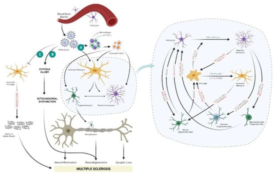 The exposure of a genetically susceptible person to a potential viral trigger from the environment leads to a cascade of autoimmune responses leading to demyelination and MS development. These insults interrupt the balance between myelin antigens in axons (as myelin sheets that surround axons) or oligodendrocytes (myelin-forming cells) and T-cells [62]. Viral entry to the CNS could initiate the first stage of MS progression involving various types of cells, mainly innate and adaptive immune cells, and glial cells [63]. The innate immune cells respond to an external stimulus by recognizing the pathogen-associated molecular patterns (PAMPs) by PRRs, mainly by TLRs that are receptors expressed on the innate immune cells [63,64]. Effector mechanisms by the activated innate immune system include the production of nitric oxide and oxidative burst, the phagocytosis of nearby pathogens, apoptotic cells, and myelin sheaths, the production of chemokines and cytokines, antigen presentation to the adaptive immune cells, tropic factors secretion and the release of MMPs that disturbs the extracellular matrix and the BBB [63]. Signals from the innate immune system activate the adaptive immune system to expand the T-cells and B-cells [64].
