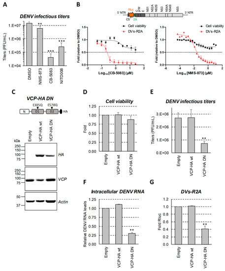 VCP ATPase inhibition impairs DENV replication. (A) Huh7.5 cells were infected with DENV2 16681s at a MOI of 0.05. The day after, the cells were treated with DMSO, 50 nM NMS-873, 0.5 µM CB-5083, or 10 µM NITD008 as positive control. After 24 h (2 days post-infection), cell supernatants were collected, and plaque assays were performed. (B) Huh7.5 cells were infected with the DENV2 16681s Renilla luciferase (Rluc)-expressing reporter virus (DVs-R2A) at a MOI of 0.001. One day post-infection, the infected cells were treated with various concentration of CB-5083 or NMS-873. After 24 h (2 days post-infection), Rluc assays were performed. Cell viability was measured in uninfected cells by CellTiter-Glo luminescent assays. The plotted data are relative to the DMSO treatment control. The dot line is a marker of a 50% decrease in viability or replication. NTR: non-translated region; 5′ CS: 5′ cyclization sequence; 2A: Tosea asigna virus 2A cleavage site at the C-terminus of Rluc to ensure proper processing after polyprotein synthesis. (C,D) Huh7.5 cells were transduced with lentiviruses expressing wild-type VCP or the depicted dominant negative VCP E305Q/E578Q mutant (MOI = 1). Four days post-transduction, the cells were collected and analyzed by Western blotting using the indicated antibodies (C) or subjected to MTT assays (D). (E,F) The cells were transduced as in (C). Two days post-transduction, the cells were infected with DENV2 16681s at a MOI of 0.05. Two days post-infection (four days post-transduction), extracellular infectious titers and relative intracellular DENV RNA levels were determined using plaque assays (E) and RT-qPCR (F), respectively. (G) Cells were transduced as in (C). Two days post-transduction, cells were infected with DVs-R2A at a MOI of 0.001. Two days post-infection (4 days post-transduction), viral replication was measured using Rluc assays. All results are representative of two or three independent experiments. **: p-value ≤ 0.01; ***: p-value ≤ 0.001.