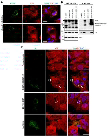 Our previous interactomic study has identified VCP as a protein partner of NS4B in infected cells []. To obtain more insight about a potential co-opting mechanism of VCP by the DENV through NS4B, VCP localization in DENV-infected Huh7.5 cells was analyzed using confocal microscopy. In uninfected conditions, VCP did exhibit a diffuse distribution throughout the cell. In contrast, two days post-infection, VCP distribution was drastically altered (Figure 2A). Indeed, this protein accumulated in large NS4B-enriched structures (Figure 2A, white arrows), which we have previously demonstrated to be devoid of dsRNA and to be CMs using correlative light-electron microscopy (CLEM) (Figure 2B, white arrows) []. In addition, VCP relocalized to the NS4B-positive perinuclear area (Figure 2A) in which dsRNA (i.e., replication complexes) typically accumulates (Figure 2B) []. Although these phenotypes are consistent with the reported NS4B/VCP interaction in infected cells [], we next assessed whether it required the contribution of other viral proteins. We transfected Huh7.5 cells stably expressing the T7 RNA polymerase (Huh7.5-T7) with a plasmid encoding NS4B as the HA-tagged NS4A-2K-NS4B precursor under the control of the T7 promoter, exactly as reported before [,]. We initially chose to express this precursor because it is readily detectable by confocal microscopy, with a much punctated distribution as compared to the one of the pseudo-mature 2K-NS4B [,]. Indeed, in transfected cells, NS4B localized in large punctae in which VCP partially redistributed (Figure 3A,C, white arrows). Although such punctae were less abundant in 2K-NS4B-HA-expressing cells, they were also enriched in VCP (Figure 3C, white arrows). In contrast, VCP distribution in HA-NS4A-expressing cells was comparable to that in control cells. This suggests that NS4B and VCP can interact in the absence of other proteins. To confirm this, we performed co-immunoprecipitations directed against the HA-tag with cells expressing HA-tagged NS4B proteins (Figure 3B). Endogenous VCP was readily detected in the eluates when immature or mature NS4B-HA was pulled-down, whereas very little, if any, was present in control conditions in which untagged NS4B proteins were expressed. These results demonstrate that VCP interaction with DENV NS4B does not absolutely require other viral proteins.