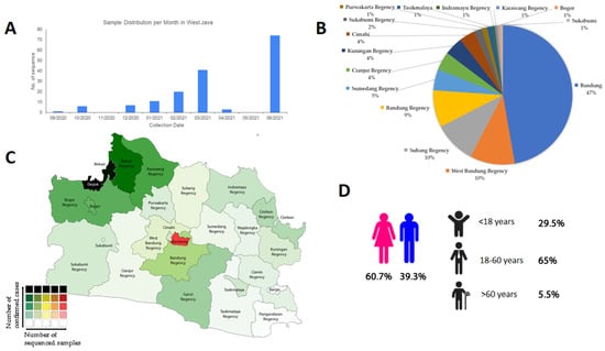 The number of SARS-CoV-2 samples from September 2020 to June 2021 showed a significant increase, although decreases were documented briefly in November 2020, April 2021, and May 2021, as shown in Figure 1A. Bandung contributed most of the samples (47%), followed by West Bandung (10%), Subang (10%), Bandung Regency (9%), and Sumedang (5%), as shown in Figure 1B,C. Most of our samples were female patients (60.7%) and working-age patients (age 18 through 60, accounting for 65% of the samples), as shown in Figure 1D. This is consistent with other findings in Southeast Asia and Asia, where most positive COVID-19 cases are dominated by people of working age with no distinct segregation between females and males [,]. In Indonesia, sequenced samples were comprised of 50.5% female samples and 48.6% male samples (with 0.9% of the samples having no information). In Southeast Asia and Asia, a significantly large proportion of the samples with no information on sex hindered the female-to-male proportion from appearing as 50-50, but still showed a ratio close to 1-1 [].