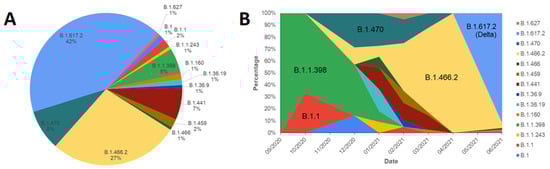 Shown in Figure 2A, samples from September 2020 to June 2021 belonged to the B PANGO variant, furthermore dominated by the VOC B.1.617.2 (Delta) variant (42%), B.1.466.2 variant (27%), and B.1.470 variant (8%), the last two enlisted as Indonesian lineages by PANGO although not being a variant of concern at a global level []. B.1.466.2 has also been designated Alerts for Further Monitoring by the World Health Organization []. Other Indonesian lineages enlisted by PANGO, the B.1.1.398 and B.1.459 variants [], contributed only to a small percentage in the samples, 5% and 2% respectively, while the B.50 was not found in this study [,]. B.1.466.2, B.1.470, B.1.1.398, and B.1.459 were more locally distributed in Indonesia and were found in lower percentages in other Southeast Asian countries []. The two other VOCs that are primarily known to circulate in Southeast Asia, the Alpha B.1.1.7 and Beta B.1.351 variants [], were absent in this study, although making up for 19.2% and 1.6% of the Asian samples respectively, and 43.1% and 1.1% of global samples respectively. Indeed it was found that predominating variants in Indonesia were B.1.466.2 and B.1.470 as of 1 June 2021, and that the Alpha and Beta variants were more dominating in other regions of Southeast Asia, such as Thailand, Cambodia, Philippines, and Vietnam [], and in Asia as a whole [].