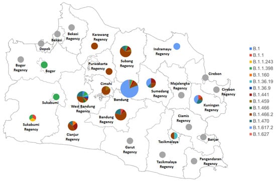 Map of diversity of SARS-CoV-2 variants circulating in each city and district of West Java, Indonesia in September 2020–June 2021. Grey color indicates absence of samples from the city/regency.