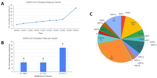 Distribution of mutations in SARS-CoV-2 samples sequenced by WJHL, isolated from West Java, Indonesia from September 2020 to June 2021. (A) Mutation rate per month. (B) Mutation rate for SARS-CoV-2 variants dominating WJHL samples. Error bars represent standard deviations of the means. Different letters on top of each bar show a significant difference between variants according to Kruskal-Wallis test (p = 0.05). Kruskal-Wallis test results are available in Supplementary Figure S1. (C) Percentage of hotspot mutations across SARS-CoV-2 genomic regions. Percentage of each genomic region is expressed by dividing the number of all mutations found in the region by the total number of mutations found in all samples. Details on hotspot mutations are available in Supplementary Table S2.