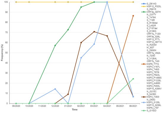 Plotting the frequency of hotspot mutations occurrence against time showed that different mutations fluctuated over time. Figure 5 displays some examples of this phenomenon. The D614G mutation in the spike protein and the P323L mutation in the NSP12 are constantly present in all samples from September 2020 to June 2021. Q57H in the ORF3a was first documented at the end of 2020 and underwent a rise in number until April 2021. S126L in NSP3 was first documented at the end of 2020, before disappearing, making a constant rise in number since its reemergence in February 2021, peaking at April 2021, and decreasing through June 2021. T350I in NSP3 was first documented at the end of 2020, constantly increasing until March 2021 and decreasing until June 2021. G142D in the spike and T77A in the NSP6 protein were first documented in April 2021 and have since increased.