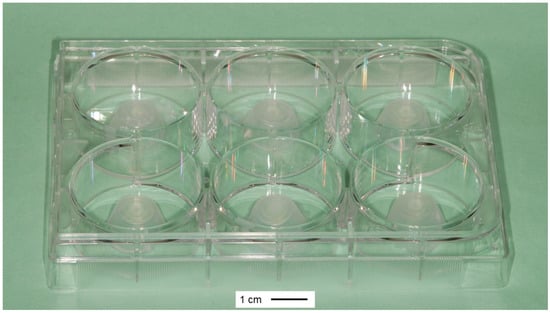 A novel ex-vivo bovine cornea model was developed and utilized with modifications of previously described protocols for equine, feline, and canine corneal tissues [29,30,31]. Prior to the first day of the experiment, plastic pedestal conformers for corneal support during tissue culture were created by removing the rounded ends of 6 mL plastic Luer lock syringe casings (Covidien, Dublin, Ireland) and cutting them to ½ inch (1.27 cm) height. Each resulting pedestal was secured centrally (concave-side down) within the wells of 6-well tissue culture plates (Corning Costar) using cyanoacrylate adhesive (Krazy Glue®, Elmer’s Products, Westerville, OH, USA). This design was intended to preserve the normal bovine corneal curvature radius and maintain three-dimensional corneal shape (Figure 1). The plates were gas-sterilized with ethylene oxide prior to use.