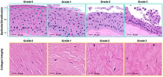 Semiquantitative histopathology grading scheme for bovine corneal sections. Epithelial stratification:0 = clear distinction of basal, wing, and squamous cell layers; 1 = weak disorganization with minor squamous separation; 2 = moderate disorganization with moderate squamous separation; 3 = marked disorganization with significant squamous separation and degenerate basal cell attachments. Basal (B), wing (W), and squamous (S) cell layers are indicated in the Grade 0 image. Stromal organization: 0 = no stromal disorganization; 1 = weak stromal disorganization; 2 = moderate stromal disorganization; 3 = marked stromal disorganization. All images are photomicrographs magnified to 400X.