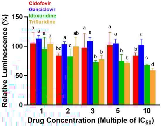 To compare the antiviral compounds employed in the in-vitro assays for cytotoxic effects in MDBK cells, a CellTiter-Glo® kit (Promega, Madison, WI, USA) was used according to manufacturer recommendations. Briefly, trypsinized MDBK cells (grown at 37 °C/5% CO2) in DMEM + 10% FBS/1% PS were transferred to 96-well tissue culture plates (Corning Costar, Cambridge, MA, USA). After incubation at room temperature for 1 h, growth medium was decanted and replaced with DMEM + 2% FBS/1% PS containing 1X, 2X, 3X, 5X, or 10X the IC50Area values established for each antiviral compound (cidofovir, ganciclovir, idoxuridine, and trifluridine) in the plaque reduction assay. Negative control wells containing MDBK cells in media without added antiviral compounds and separate blank wells containing only liquid media without cells were included on each plate. Plates were incubated at 37 °C/5% CO2 for 48 h and were then transferred to room temperature for 30 min immediately prior to the assay. CellTiter-Glo® reagent (containing a patented variant of luciferase enzyme) was added to each well of MDBK cells, and cell lysis was induced using an orbital shaker at room temperature for 2 min. Following lysis, plates were incubated at room temperature for 10 min before luminescence was measured with a microplate reader (Synergy HTX, BioTek, Winooski, VT, USA). Eight replicates were assessed for all combinations of antiviral compounds and concentrations. Cytotoxicity was expressed as relative luminescence (RL), which is calculated as the mean luminescence of a given antiviral compound/concentration divided by the mean luminescence of the plate negative control.