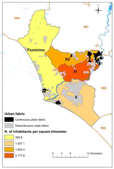 In the two coastal areas (Fiumicino District and X District), the urban fabric is mainly discontinuous and concentrated along the coast of the Fiumicino Municipality, and rapidly increases towards the centre of Rome. Figure 1 represents the study area and the boundaries of the four districts, the urban fabric and the human population density. The map was created using ArcGIS 10.8 software.