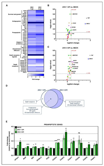 ZIKV infection modulates the expression of genes related to cell survival and cell death pathways. Mock- and ZIKV-infected (MOI 5) SH-SY5Y cells were harvested and processed at 1 and 2 dpi for gene expression analysis by qPCR. (A) Fold-change heatmap of target genes. Color coding: white: gene expression not detected; dark blue: genes with fold-change of more than four-fold. (B,C) Volcano plots of fold-change with respective statistical significance analyzed at 1 dpi (B) and 2 dpi (C), according to unpaired t-test compared to mock-infected samples. Color coding: (D) Venn diagram showing numbers of genes with expression variation of more than two-fold at each or both of the analyzed timepoints and information on gene function. (E) Expression levels of proapoptotic genes at 1 (light green bars) and 2 dpi (dark green bars). Data represented as mean ± (SD) of one experiment performed in duplicate. Statistical analysis performed by one-way ANOVA followed by Tukey’s post-test. ns—non-significant, * p < 0.05, ** p < 0.01, **** p < 0.0001, according to Tukey’s post-test.