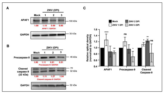 ZIKV infection triggers intrinsic apoptotic pathway. Mock- and ZIKV-infected (MOI 5) SH-SY5Y cells were harvested at the indicated timepoints and processed for immunoblotting analysis. Membranes were labeled with (A) anti-APAF1, (B) anti-caspase-9, and anti-GAPDH primary antibodies and appropriate HRP-conjugated secondary antibodies. Values in red show protein fold-change relative to mock-infected samples. Densitometry values were normalized to GAPDH before expression analysis. kDa—kilodaltons. (C) Relative quantification of densitometry analysis. Values are represented as mean ± S.D. Data representative of three independent experiments performed in triplicate. * p < 0.05, ** p < 0.01, **** p < 0.0001, ns—not significant, according to unpaired t-test compared to mock-infected.