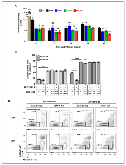 For ROS scavenging assay, NAC (Sigma-Aldrich, St. Louis, MO, USA) was diluted in sterile water or cell culture medium at concentrations of 500 μM, 750 μM, and 1 mM. ZIKV-infected cells were treated 2 h before or immediately after viral inoculation. After 2 h of viral inoculation, cell culture media only (mock-treated) or containing NAC (NAC-treated) was renewed in both mock- and ZIKV-infected samples, and samples were incubated for the indicated times post-infection. Treated and mock-treated cell culture media were renewed every two days, and cells were stained with Annexin V-FITC and 7-AAD after the indicated timepoints and analyzed by FCM.