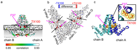 While NMR data [35] suggest that there is an extended conformational change between the pocket factor inducible conformational state A and the other state B, we saw only localized differences in the rotamer conformation of Phe-97 between “conformation 1” and “conformation 2”. Other than presented here, the previous NMR study used substantial amounts of TX100 during cell lysis probably generating a mixed population of CLPs with and without bound TX100. Consequently, the pocket factor free state B was enriched by procedures that deplete TX100 such as size exclusion chromatography or reassembly of capsids from dimers. Therefore, we suspect that the large changes between state A and B represent mainly the presence or absence of TX100. This is further supported by our EM-maps that show TX100 in the immediate vicinity of most residues that change their conformation according to the NMR measurements.