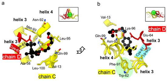 One of the hydrophobic pockets with bound TX100 in the CD-dimer. (a,b) show two views, which are perpendicular to each other. The general viewing direction of the pocket is shown in the inserts in the upper left corner of the panels. The approximate positions of the close-ups below are indicated with circles filled in green. The close-ups show TX100 in black in ball and stick representation together with all residues within a distance of 4 Å. TX100 is located at the dimer interface between chains D (red) and chains C (yellow). The head group of TX100 is close to Cys-61 of both chains at the dimer interface (marked in blue in (b)). Phe-97 is in an orientation where it supports π-stacking with Trp-62 ((b), marked in green). Lys-96 makes H-bonds with the oxygens in TX100 (dashed line).