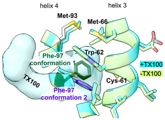 Close-up of models of HBc-CLPs with added TX100 (+TX100,cyan) and HBc-CLPs without TX100 (-TX100, green, 7OD4, [10]) superimposed on top of each other. The close-up is centered on Trp-62 in chain B and TX100 (shown in space fill representation). Both models differ only in the rotamer conformation of Phe-97. In the absence of TX100, Phe-97 points towards Cys-61 (green, “conformation 1”). In the presence of TX100, TX100 occupies the position of Phe-97 side chain in “conformation 1” and, Phe-97 (blue, “conformation 2”) makes a π-stacking interaction with Trp-62, which is further extended by Met-66 towards the tip of the spike.