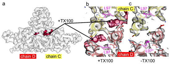 HBc-F97L with and without added TX100. (a) Surface representation of the map of HBc-F97L with added TX100: The map covers the CD-dimer, the rest is omitted for clarity. The density in the hydrophobic pocket is attributed to TX100 and is colored in red. (b,c) slab of the maps and models of F97L-HBc through the hydrophobic pocket with added TX100 (b) and without TX100 (c). Chain D is shown in red and chain C in yellow. Leu-97 is shown in magenta in ball and stick representation. Without TX100, Leu-97 in chain D (L97*) is in a conformation akin to “conformation 1” of Phe-97 in wt HBc. All other Leu-97 in (b,c) are in a conformation similar to “conformation 2” of Phe-97 in wt HBc. The surface representations show the “power-adjusted maps” calculated at the same density threshold.