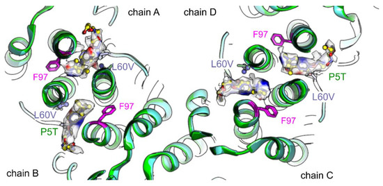Superposition of models of HBc-L60V (blue) and HBc-P5T (green) with added TX100. The view shows a close-up of the asymmetric unit with chains A, B, C and D and is centered at the hydrophobic pocket. The side chains of Phe-97 (magenta), Pro/Thr-5 and Leu/Val-60 (dark-blue for HBc-L60V and dark green for HBc-P5T) are shown for both models. TX100 (dark blue in HBc-L60V and yellow in HBc-P5T) is shown together with its surrounding map densities. The densities are colored with the differences between both maps (red: additional density in HBc-L60V and blue additional density in HBc-P5T). For difference imaging both maps were locally aligned.