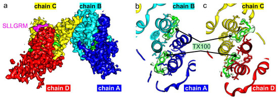 Next, we determined the structure of HBc-CLPs with bound TX100 by electron cryo- microscopy. Electron micrographs (Figure 2a) showed similar CLPs of HBc with added TX100 as previously observed for CLPs purified in the same way but without TX100 [10]. One of the marked differences was the lower particle density of TX100 containing samples compared to detergent-free samples at a similar protein concentration. We attribute this difference to a reduced interaction with the air water interface in the presence of detergent as previously described for other systems [50,51]. The 2D-class averages showed that most CLPs had dimensions consistent with capsid formed by 240 subunits in a T = 4 assembly (Figure 2b). We calculated 3D-maps of these CLPs to a resolution of 3.1 Å (Table 1), which showed the expected two dimers per asymmetric unit (Figure 2c). Differences to the previously determined map of HBc CLPs in the absence of TX100 (EMD12819, [10]) accumulated around the hydrophobic pockets, which contained additional densities (Figure 3).