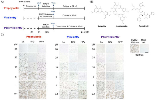 The viral entry experiment (at 0 h of virus inoculation, 0 h) aimed to examine how the compounds interfered with viral attachment. The virus at 10 TCID50 was mixed with serially diluted compounds to a final concentration of 100, 50, 20, 10, 5, 1, and 0.1 μM per well prior to incubation with the cells at 37 °C for 2 h. The virus-drug mixture was then replaced with fresh culture medium and the cells were incubated at 37 °C for 24 h. In the post-viral entry experiment (+2 h), we examined the effects of the compounds on the virus after the entry step. The cells were incubated with FMDV at 10 TCID50/well at 37 °C for 2 h for viral adsorption. Then, the cells were washed once with PBS pH 7.4 (Sigma Aldrich®, St. Louis, MO, USA) before incubation with serially diluted compounds as mentioned above at 37 °C for 24 h. Rupintrivir (3Cpro inhibitor; Sigma Aldrich®, St. Louis, MO, USA), ribavirin (a broad-spectrum antiviral drug; Sigma Aldrich®, St. Louis, MO, USA), and DMSO (non-inhibitor vehicle, Sigma Aldrich®, St. Louis, MO, USA) were used as positive and negative controls, respectively. In all experiments, viral reduction was further evaluated as described in the following sections.