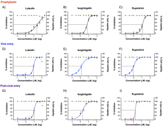 Dose–response curves between the effects of luteolin and isoginkgetin on FMDV inhibition and their cytotoxic effects on BHK-21 cells were established. Antiviral activities of the phytochemical compounds in the prophylaxis (A–C), viral entry (D–F), and post-viral entry (G–I) experiments were determined at different times of infections. The FMDV-infected cells were treated with different compound concentrations as depicted in Figure 1A and the numbers of FMDV-infected cells were determined by IPMA. The viability of the treated cells was also measured and compared to that of the cell control with 1% DMSO (non-inhibitor control) using the MTS assay (green line). Rupintrivir was used as a positive antiprotease drug control. All experiments were carried out in triplicates.