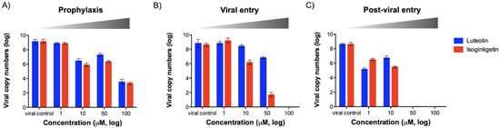 Dose-dependent inhibition of luteolin and isoginkgetin on FMDV replication as examined by RT-qPCR. The antiviral activities of each compound were determined by the reduction of viral copy numbers in the FMDV-infected cells compared to that of the virus control with 1% DMSO (non-inhibitor control). Prophylaxis (A), viral entry (B), and post-viral entry (C) experiments were designed as shown in Figure 1A. The data are reported as means and SD of viral copy numbers from triplicate experiments.