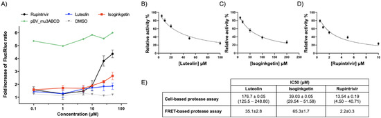 Cell-based and FRET-based protease assay used to evaluate the anti-FMDV 3Cpro activities of luteolin and isoginkgetin. pBV_3ABCD containing a gene encoding for the FMDV-3ABCD GAL4-binding domain and VP16 activation domain, and pG5luc reporter plasmid with the GAL4-binding site were co-transfected into HEK293T cells prior to incubating with the 10-fold serially diluted compounds. The firefly (Fluc) and Renilla (Rluc) luciferase levels generated from each treatment was measured and reported as Fluc/Rluc ratios (A). The IC50 values of luteolin (B), isoginkgetin (C), and rupintrivir (D) determined by the FRET-based protease assay were measured to be 35.1 ± 2.8, 65.3 ± 1.7, and 2.2 ± 0.3 μM, respectively, based on the inhibitor concentration-dependent curves. The IC50 values obtained from two different protease assay methods were summarized in (E).