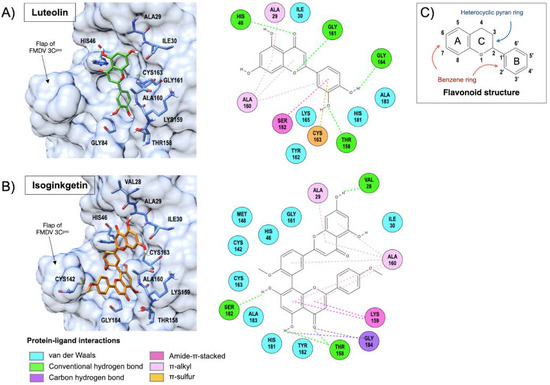 Molecular docking of FMDV 3Cpro and protein–ligand interactions of luteolin (A) and isoginkgetin (B) with the binding pocket of FMDV 3Cpro. The illustration colors for the protein-ligand bonds and interactions are presented at the bottom of Figure (B). The basic core structure of flavonoid contains two benzene rings (A and B rings) connected by a heterocyclic pyran ring (C ring) as shown in (C). Luteolin reacted to the catalytic residues, His46 and Cys163, whereas isoginkgetin showed van der Waals interaction with His46 and Cys163 as well as the Cys142 flap. The color circle of the amino acids indicates the interactive residues of the 3Cpro and bond types as depicted at the bottom of the left panel.