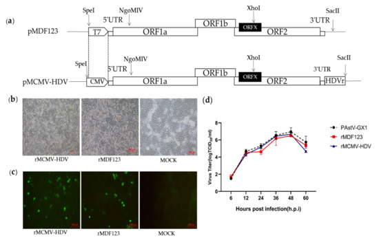 In a previous study, we developed an RNA-launched infectious clone of PAstV (pMDF123). In order to generate DNA-launched infectious clones of PAstV, the T7 promoter in pMDF123 was replaced with a CMV promoter and an HDVr element was inserted immediately after the viral tail region of pMDF123 in order to produce the exact 3′ end sequence of the viral genome (Figure 1a). The RNA-launched infectious clone pMDF123 and DNA-launched infectious clone (pMCMV-HDV) were then transfected into BHK-21 cells. At 48 h.p.t, the transfection products from BHK-21 cells were used to inoculate PK-15 cells for recovery of the recombinant viruses. Obvious cytopathic effects (CPEs) characteristics of rounding and detachment of cells were subsequently observed in the resultant PK-15 cells (Figure 1b).