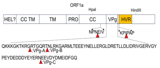 Transposon-mediated random insertion was used to identify sites in the PAstV ORF1a that would allow the insertion of a 15 nt sequence. BHK-21 cells were then transfected with the replicon sub-library harboring the 15 nt insertion in ORF1a. PK-15 cells were then infected with the transfection products at 48 h.p.t in order to rescue the recombinant viruses. Fragments encompassing the screen regions of recombinant viruses were amplified by RT-PCR and then sequenced. The results showed that five viable insertion sites were identified in the ORF1a of mutant viruses. One insertion site was located in the predicted CC structure domain; three were located in the predicted VPg region, namely, VPg-A, VPg-B, and VPg-C; and one was located upstream of the predicted HVR (Figure 2). The sites of insertion and nucleotide sequences of the 15 nt insertions are shown in Table 1.