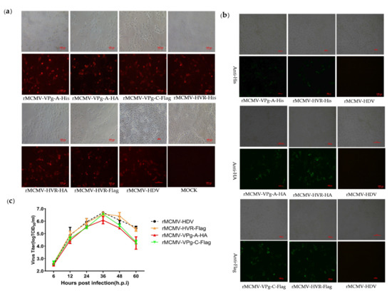 In order to determine the replication characteristics of tag viruses, multi-step growth kinetics of the recombinant viruses were analyzed. The results showed that the tagged and parental viruses displayed comparable growth behavior between 6 to 36 h.p.i. However, the overall yield of rMCMV-VPg-A-HA was nearly 1 log less than that of the parental viruses (Figure 3c). To assess their genetic stability, the tagged viruses were passaged serially at least fifteen times. The supernatants from P3, P6, P9, P12, and P15 were collected, and the cDNA fragments containing the tag sequences were amplified by RT-PCR, followed by nucleotide sequence determination. The results showed that the tag sequences remained detectable for at least 15 cell passages (Figure S1).