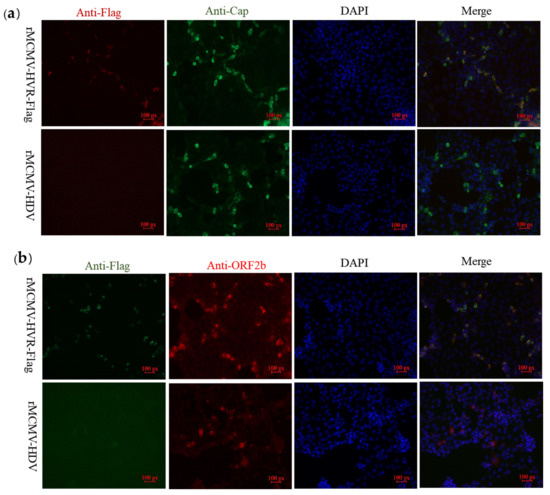 In order to explore whether epitope tags embedded in the ORF1a protein would allow the detection of interactions between the structural proteins, ORF2b protein or Cap, and non-structural proteins coded by ORF1a, PK-15 cells were inoculated with the recombinant virus, rMCMV-HVR-Flag. IFA was performed using PcAbs against either Cap or ORF2b proteins as well as a mAb against the Flag tag. The results showed that the Flag-tagged ORF1a protein co-localized with Cap and ORF2b proteins in PK-15 cells (Figure 4).