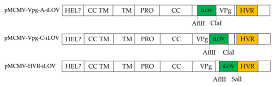 The 15 nt insertions in an HpaI-to-HindIII fragment were replaced with different epitope tags or fluorescent proteins (iLOV) using SOE-PCR, and the primers used are listed in Table S1. Briefly, fragments harboring epitope tags were amplified with ORF1a-1606-F/ORF1a-2575-R as the outer primers and CC/VPg/HVR-His/Flag/HA-F/R as the inner primers using pMDF123 as a template. Fragments containing AflII and SalI (NEB, Beverly, MA, USA) restriction enzymes were amplified with ORF1a-1606-F/ORF1a-2575-R as the outer primers and HVR-AflII-F/HVR-SalI-R as the inner primers using pMDF123 as a template. The amplified fragments harboring tags or the AflII and SalI restriction enzymes were then digested with HpaI and HindIII restriction enzymes and ligated into pMCMV-HDV digested with the same restriction enzymes, resulting in plasmids, pMCMV-CC/VPg/HVR-His/Flag/HA and pMCMV23-HVR-AflII/SalI, respectively. The iLOV gene was amplified with primers iLOV-AflII-F and iLOV-SalI-R and then digested with AflII and SalI. The digested iLOV was ligated into similarly digested corresponding regions of pMCMV-HVR-AflII-SalI, resulting in the production of plasmid, pMCMV-HVR-iLOV.