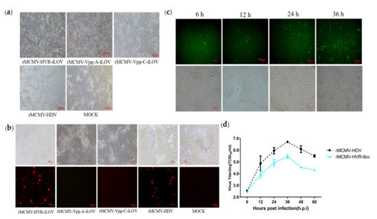 Efficient replication of recombinant viruses harboring epitope tags in the ORF1a protein made it possible to insert a reporter protein in order to visualize viral replication in living cells by fluorescence microscopy. To achieve this aim, a small fluorescent gene, iLOV, was inserted into the Vpg-A, Vpg-C, and HVR sites in ORF1a, as shown in Figure 5. The recombinant clones harboring the iLOV gene were transfected into BHK-21 cells. The supernatants from the transfected cells were then passaged into PK-15 cells at 48 h.p.t. CPEs were observed in PK-15 cells inoculated with supernatants from the pMCMV-HVR-iLOV-transfected cells, but not in pMCMV-Vpg-A-iLOV, pMCMV-Vpg-C-iLOV, or mock-transfected PK-15 cells, as shown in Figure 6a. In order to confirm the expression of Cap protein, cells infected with recombinant viruses were incubated with anti-Cap PcAb and then stained with a secondary antibody. As shown in Figure 6b, Cap protein could be detected in PK-15 cells inoculated with supernatants from the pMCMV-HVR-iLOV-transfected cells, but not in pMCMV-Vpg-A-iLOV, pMCMV-Vpg-C-iLOV, and mock-transfected PK-15 cells. To monitor a PAstV infection in real-time, PK-15 cells were infected with rMCMV-HVR-iLOV. The live iLOV-expressing cells at the indicated time-points were observed using a fluorescence microscope. As shown in Figure 6c, iLOV positive cells were observed in rMCMV-HVR-iLOV-infected cells as early as 6 h.p.i. There were more iLOV positive cells at 24 and 36 h.p.i, which indicated the spreading of the virus as the infection progressed. The growth kinetics were compared between the reporter and parental viruses. As shown in Figure 6d, the growth curves displayed comparable growth behavior between the reporter and parental viruses. However, the virus titer at 36 h.p.i was nearly 1 log less than that of the parental virus.