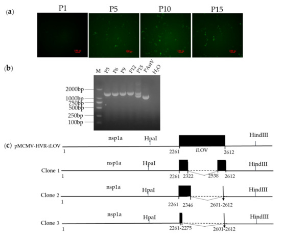In order to determine the genetic stability of the iLOV gene in the genomes of the resulting recombinant viruses, P1, P5, P10, and P15 of each reporter virus were used to infect PK-15 cells, and live cells were imaged at 24 h.p.i to evaluate the percentage of cells expressing iLOV. As shown in Figure 7a, the expression of iLOV in PK-15 cells with P5, P10, and P15 reporter virus could be directly visualized using a fluorescence microscope. The number of cells showing green fluorescence decreased markedly in P15 reporter virus-infected cells. To further identify whether the iLOV gene in the HVR sites was genetically stable during serial passages, viral RNA was extracted from P3, P6, P9, P12, and P15 viruses. Subsequently, the targeted fragments encompassing the inserted site were amplified by RT-PCR and sequenced. As shown in Figure 7b, an expected band of approximately 1 kb was detected from the parental virus RT-PCR products. An expected band of approximately 1.3 kb was obtained using P3, P6, P9, and P12 viruses as templates. A smaller PCR product of approximately 1 kb became apparent upon addition to the 1.3 kb fragment when using the P15 reporter virus RT-PCR products as templates. The sequencing results of the smaller sized PCR products showed that the P15 reporter virus produced partially deleted nucleotides in the iLOV gene (Figure 7c). These results suggested that the recombinant viruses harboring iLOV were only genetically stable for up to 12 cell passages.