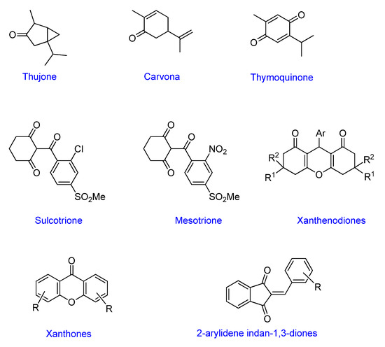 Cyclic ketones, either natural or synthetic, are compounds endowed with valuable biological activities. For example, thujone, carvone, and thymoquinone (Figure 1) are natural monoterpene ketones and present, respectively, antiviral [27,28], antioxidant [29], and antifungal [30] activities. The triketones sulcotrione and mesotrione are modern herbicides used to control several weed species in different crops [31]. Indan-1,3-diones bearing arylidene groups display leishmanicidal and cytotoxic activities [32]. Other important cyclic ketones are the xanthenodiones [or 1,8-dioxo-octahydro-xanthenes] characterized by the presence of a pyran-nucleus fused to a cyclohexe-2-one ring on both sides. These compounds present a variety of biological functions, including anti bactericidal, leishmanicidal, antifungal, antitumoral, and tripanocidal activities [33,34]. Xanthenodiones resemble xanthones, a class of natural compounds known for their numerous pharmacological applications including antiviral, antimicrobial, hepatoprotective, anticancer, antioxidant, and anti-inflammatory applications [35]. These examples show the diverse biological profile presented by cyclic ketones that can be explored in the pharmaceutical and agrochemical fields.
