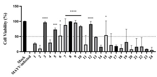 Antiviral screening of twenty-four cyclic ketones against MAYV. The MTT method was used to determine the cell viability of cells infected with MAYV and treated with the different compounds. For negative control, uninfected Vero cells (mock) were defined as 100% cell viability, and positive Control (MAYV-infected) was defined as 0%. **** p < 0.0001; *** p < 0.001; * p < 0.05.