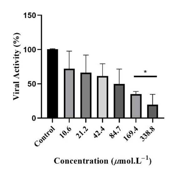 Subsequently, we evaluated lysis plaque formation after MAYV-infected cells were treated with compound 9. The goal was to verify if the substance would interfere in intracellular stages of the viral cycle, such as replication, particle assembly, or budding. At the highest concentration (338.8 µmol·L−1), viral activity was inhibited by 71% (Figure 4B).