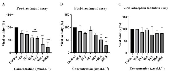 We conducted a series of plaque-forming tests to evaluate compound action in different stages of the viral cycle. First, we aimed to evaluate whether pre-treatment of cells with compound 9 could affect the development of the MAYV cycle. Therefore, Vero cells were pre-treated with different serial dilutions of compound 9 and incubated for 3 h, followed by the addition of MAYV suspension. As indicated in Figure 4A, compound 9 inhibited 77% viral activity at the highest concentration (338.8 µmol·L−1). Lower concentrations also impacted viral activity, although not the same extension. At 139.4 µmol·L−1, viral activity was inhibited by 66%, at concentrations 84.7 and 42.4 µmol·L−1 inhibition was approximately 40%.