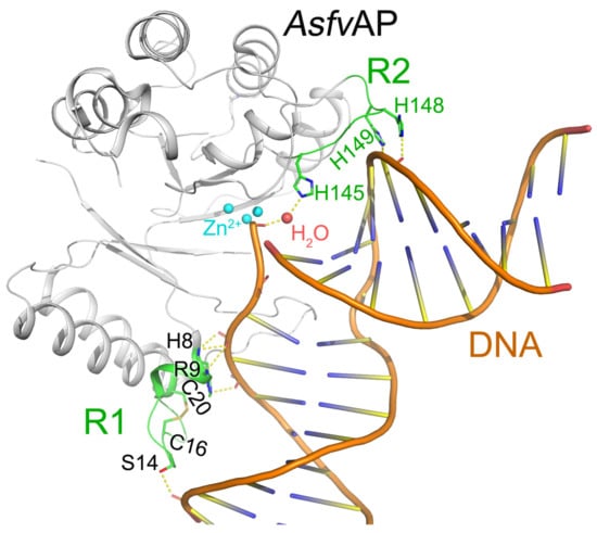 AsfvAP participates in the BER pathway of ASFV and is essential for ASFV survival in the host cells [22]. Differed from other Aps, AsfvAP adopts a unique DNA-binding mode [19]. Additionally, it also has new structural features, including one narrower nucleotide-binding pocket at the active site, a histidine-rich region R2, and a C16–C20 disulfide bond containing region R1 (Figure 2). These features are important for AsfvAP to adapt to the acidic and oxidative environment [23]. The residues outside the nucleotide-binding pocket are important in assembling AsfvAP and in binding nucleotide. For example, the disulfide bond formed between Cys16 and Cys20 is important for AsfvAP function. Although the S-S bond does not interact with DNA directly, the region R1 containing disulfide bond plays important roles in binding DNA (Figure 2). When the reducing reagents such as DTT break the S-S bond, the conformation of R1 will be changed and the AsfvAP’s DNA binding ability is compromised [19]. The AsfvAP structure also has a histidine-rich R2 loop that directly interacts with the pre-cleaved DNA strand. Moreover, the R2 loop can interact with the 5′-phosphate group of 5′-deoxyribose phosphate through one water molecule (Figure 2) [19]. However, AsfvAP prefers acidulous condition to exert its AP endonuclease activity. When the environment pH is higher than 6.3, AsfvAP’s activity will be reduced.