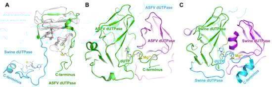 Figure 3. Structures of ASFV dUTPase and swine dUTPase. (A) Subunit superimposition of ASFV dUTPase (pdb: 6LJ3) and swine dUTPase (pdb: 6LJJ) [31]. (B) The novel two-subunit active sites in ASFV dUTPase. (C) The classical three-subunit active sites in swine dUTPase. Different subunits are indicated by different colors. The C-terminus is highlighted. The dUTP is indicated as sticks and colored by element. The magnesium ion is indicated by the yellow sphere.