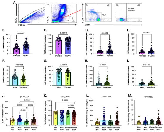 Among women, those with HIV had higher proportions of total monocytes compared to those without HIV (4.1 [IQR, 3.1–4.8] vs. 2.9 [IQR, 2.2–3.3]; p < 0.001; Figure 1J). There were differences in the proportions of CD14+CD16- classical monocytes (p = 0.0036) and CD14+CD16+ inflammatory monocytes (p = 0.049) by sex and HIV status (Figure 1K,L). No significant differences were found in the proportion of CD14dimCD16+ patrolling monocytes by sex and HIV status (Figure 1M).