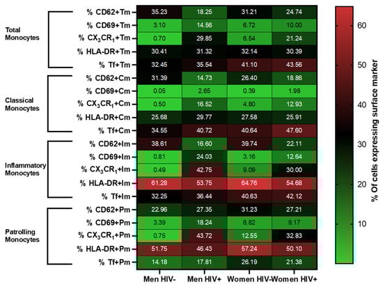Monocyte phenotyping by sex/HIV status. Heat map depicting the percentage of expression of CD62p, CD69, CX3CR1, HLA-DR, and tissue factor in total, classical, inflammatory, and patrolling monocytes (Y axis) by sex/HIV group (X axis). The numbers indicated within each box are the average percentage of cells expressing the surface marker indicated in the Y axis, for the given sex/HIV group indicated in the X axis.