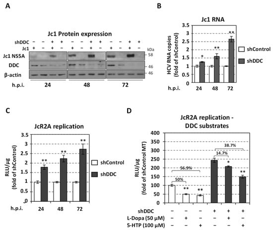 Effect of DDC silencing on HCV replication and on the antiviral activity of DDC substrates. Huh7.5 cells were electroporated with psi-LVRH1GP/sh-DDC (shDDC) plasmid or the control vector (shControl), inoculated 24 h p.t. with Jc1 (MOI = 1) (A,B) or the reporter virus JcR2A (MOI = 0.5) (C,D) for 4 h, and lysed at the indicated post-infection hours (h.p.i). (A) Western blot analysis of shDDC (+) and shControl (−) cells, using anti-DDC antibody, anti-NS5A antibody for the detection of Jc1 infection and β-actin as loading control. Mock-infected cells were used in parallel and are symbolized as Jc1 (−). A representative experiment of three independent triplicates is shown. (B) Jc1 positive-strand RNA levels were quantified by RT-qPCR and YWHAZ mRNA was used for normalization. Values from shControl cells were set to one at each time-point. (C) JcR2A replication-derived Renilla luciferase (R-Luc) activity was quantified by chemiluminescence-based assay and expressed as relative light units (RLU) per μg of total protein amount. Values from shControl cells were set to one at each time-point. (D) JcR2A replication-derived R-Luc activity was quantified in shDDC (+) and shControl (−) cells, which were treated with 50 μM L-Dopa or 100 μM 5-HTP for 72 h starting from 4 h post-virus inoculation or were mock-treated (MT). Values from shControl MT cells were set to one. Percentages of viral-replication reduction after treatment, are shown above brackets. Bars represent mean values from three independent experiments in triplicate. Error bars indicate standard deviations. * p < 0.01, ** p < 0.001 vs. Control.
