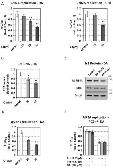 3.2. Exogenous Application of the DDC Protein Products Dopamine and Serotonin Decreases HCV Replication