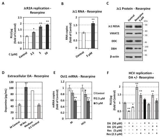 Effect of Reserpine on HCV replication. Huh7.5 cells were inoculated with JcR2A (MOI = 0.5) (A,F) or Jc1 (MOI = 1) (B–E) for 4 h, or mock infected (M) and subsequently treated for 72 h with the indicated concentrations of reserpine, or mock treated (Control). (A) Virus replication-derived R-Luc activity was determined in cell lysates and expressed as RLU/μg of total protein amount. (B) Jc1 positive-strand RNA levels were quantified by RT-qPCR and YWHAZ mRNA was used for normalization. (A,B) Values from infected mock-treated cells were set to one. Bars represent mean values from three independent experiments in triplicate. Error bars indicate standard deviations. # p < 0.05, * p <0.01, ** p < 0.001 vs. Control. (C) Western blot analysis was performed in lysates of Jc1-infected cells treated for 72 h or not (Control) with 5 μM reserpine, using anti-HCV NS5A, anti-VMAT2, anti-DDC, anti-DBH or anti-β-actin antibodies. β-actin was used as loading control. A representative experiment of three independent repetitions is shown. (D) Reserpine inhibits dopamine uptake. Huh7.5 cells were inoculated with Jc1 (MOI = 1) for 4 h, or mock infected (M), and were further cultured for 72 h with 5 μΜ reserpine or the solvent (mock-treated cells, Control), and their supernatants were collected. Extracellular Dopamine was quantified by non-competitive enzyme immunoassay and compared to the counterpart of the cell culture medium (Medium). (E) Oct1 mRNA levels were determined by RT-qPCR and normalized to YWHAZ mRNA. Values from control cells were set to one. (F) Combinatory effect of reserpine and DA on JcR2A replication. Virus replication-derived R-Luc activity was determined in cell lysates and expressed as RLU/μg of total protein amount. Values from non-treated cells (Control) were set to one. (D–F) Bars represent mean values from three independent experiments in triplicate. Error bars indicate standard deviations. # p < 0.05, * p < 0.01, ** p < 0.001 vs. Control.