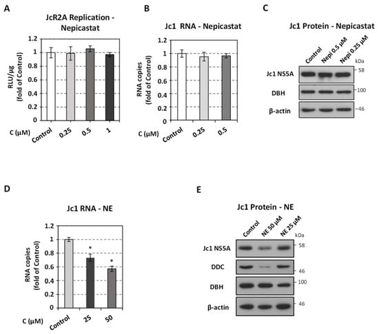 Effect of DBH inhibitor nepicastat and DBH product NE on HCV replication. (A–C) Huh7.5 cells were inoculated with JcR2A (MOI = 0.5) (A) or Jc1 (MOI = 1) (B–E) for 4 h and subsequently treated or not (Control) for 72 h with different concentrations of nepicastat (A–C) or NE (D,E), or were mock treated (Control). (A) Virus replication-derived R-Luc activity was determined in cells cultured in the presence or absence of nepicastat and expressed as RLU/μg of total protein amount. (B,D) Jc1 positive-strand RNA levels, in cells treated with nepicastat (B) or NE (D), or mock-treated, were quantified by RT-qPCR and YWHAZ mRNA was used for normalization. (A,B,D) Values from infected non-treated cells were set to one. Bars represent mean values from three independent experiments in triplicate. Error bars indicate standard deviations. * p < 0.01 vs. Control. (C,E) Western blot analysis was performed in lysates of Jc1-infected cells treated for 72 h with nepicastat (C), or NE (E) or mock-treated (Control) using anti-HCV NS5A, anti-DBH, anti-DDC or anti-β-actin antibodies. β-actin was used as loading control. A representative experiment of three independent repetitions is shown.