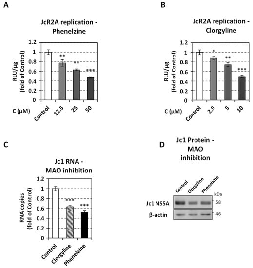 Effect of MAO inhibition on HCV replication. (A,B) Huh7.5 cells were inoculated with JcR2A (MOI = 0.5) for 4 h and subsequently treated for 72 h with the indicated concentrations of phenelzine (A) or clorgyline (B), or mock-treated (Control). Virus replication-derived R-Luc activity was determined in cell lysates and expressed as RLU/μg of total protein amount. (C) Huh7.5 cells were inoculated with Jc1 (MOI = 1) for 4 h and subsequently treated for 72 h with 10 μΜ clorgyline, 50 μM phenelzine, or mock-treated (Control). Viral positive-strand RNA levels were quantified by RT-qPCR and YWHAZ mRNA was used for normalization. (A–C) Values from infected non-treated cells were set to one. Bars represent mean values from three independent experiments in triplicate. Error bars indicate standard deviations. * p < 0.05, ** p < 0.01, *** p < 0.001 vs. Control. (D) Western blot analysis of HCV NS5A was performed in lysates of the Jc1-infected cells treated for 72 h with 10 μΜ clorgyline, 50 μM phenelzine, or mock-treated (Control). β-actin was used as loading control. A representative experiment of three independent repetitions is shown.