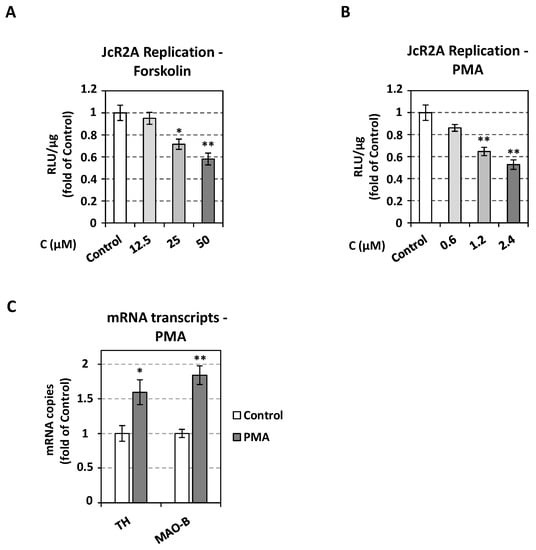 Effect of PKA and PKC activation on HCV replication. (A,B) Huh7.5 cells were inoculated with JcR2A (MOI = 0.5) for 4 h and then treated for 72 h with the indicated concentrations of Forskolin (A), PMA (B), or mock-treated (Control). Virus replication-derived R-Luc activity was determined and expressed as RLU/μg of total protein amount. (C) Effect of PMA treatment on TH and MAO-B transcription. Huh7.5 cells were treated with 2.4 μΜ PMA or mock-treated (Control). TH and MAO-B mRNA levels were quantified by RT-qPCR and normalized to the mRNA levels of the housekeeping gene YWHAZ. In all panels, values from infected non-treated cells were set to one. Bars represent mean values from three independent experiments in triplicate. Error bars indicate standard deviations. * p < 0.01, ** p < 0.001 vs. Control.