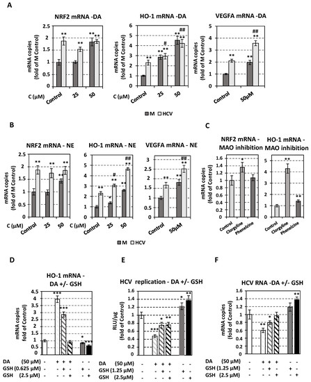 Effect of oxidative stress related to catecholamine biosynthesis and metabolism on HCV replication. Huh7.5 cells were inoculated with Jc1 (MOI = 1) (A,B,D,F) or JcR2A (MOI = 0.5) (E) for 4 h or mock-infected (M) and subsequently treated or not (Control) for 72 h with different concentrations of catecholamines (DA, NE), MAO inhibitors (clorgyline, phenelzine), or GSH. (A,B) NRF2, HO-1, VEGFA mRNA levels in infected or mock-infected cells, treated with DA (A) or NE (B), were quantified by RT-qPCR and normalized to the mRNA levels of the housekeeping gene YWHAZ. Values from M Control cells were set to one. (C) NRF2 and HO-1 mRNA levels treated with clorgyline or phenelzine mock-infected cells, were quantified by RT-qPCR and YWHAZ mRNA was used for normalization. Values from Control cells were set to one. Bars represent mean values from at least three independent experiments in triplicate. Error bars indicate standard deviations. * p < 0.01, ** p < 0.001 vs. M (mock-infected) Control, # p < 0.01, ## p < 0.001 vs. HCV-infected Control. (D–F) Effect of DA and GSH combinatory treatment on the expression of HO-1 antioxidant gene and on HCV replication, in infected cells. (D) HO-1 mRNA levels were quantified by RT-qPCR and YWHAZ mRNA was used for normalization. (E) Virus replication-derived R-Luc activity was determined in cell lysates and expressed as RLU/μg of total protein amount. (F) Jc1 positive-strand RNA levels were quantified by RT-qPCR and YWHAZ mRNA was used for normalization. In panels D–F, values from infected non-treated cells were set to one. Bars represent mean values from at least three independent experiments in triplicate. Error bars indicate standard deviations. * p < 0.05, ** p < 0.01, *** p < 0.001 vs. Control.