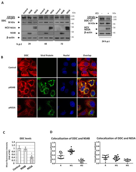 Effect of HCV protein expression on DDC levels. (A–C) Huh7-Lunet cells were electroporated with the NS4B (pEGFP-NS4B) or NS5A (pcDNA3-NS5A) expressing plasmid or with the pcDNA3 empty vector (control) and lysed at the indicated h.p.t. (A) Western blot analysis using anti-DDC, anti-NS4B and anti-NS5A antibodies. β-actin was used as loading control. In each time point, the overexpressed protein is mentioned above. A representative experiment of three independent repetitions is shown. (B) Immunofluorescence of the above, 48 h post-electroporated cells followed by confocal microscopy. Analysis of DDC (red) was performed using the rabbit polyclonal anti-DDC antibody, followed by confocal microscopy. HCV NS5A protein was stained with anti-NS5A antibody (green). HCV NS4B was detected through GFP fluorescence (green). Nuclei were stained with Hoechst 33,258 (blue). On the right, merged images of the green, red and blue fluorescence are shown. Bar, 20 μΜ. (C) Fold difference of mean DDC fluorescence intensity per cell, between cells electroporated with NS4B or NS5A and control cells, which was set as one. Error bars indicate standard deviations. * p < 0.001 vs. Control. (D) Colocalization coefficients between DDC and viral proteins. Graphical representation of the Pearson correlation coefficient (R) and Manders’ colocalization coefficient (M1, M2) values between DDC and NS4B (left) or NS5A (right). Each spot represents a single analyzed infected cell. Bars represent mean values obtained from three experiments (~30 analyzed cells/experiment).